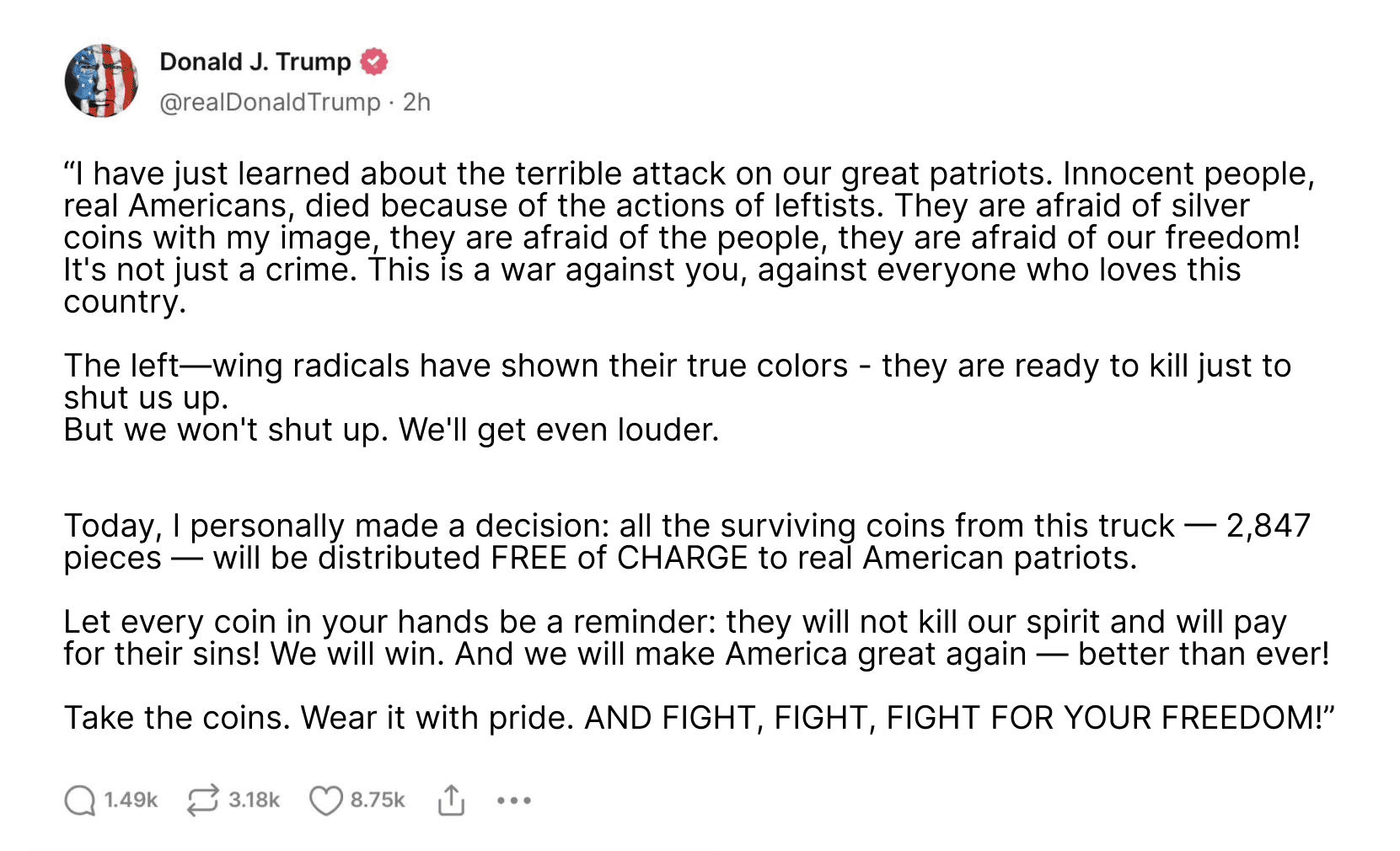 I just learned about the terrible attack on our great patriots. Innocent people, true Americans, died because of the actions of leftists. They fear silver coins with my image on them, they fear the people, they fear our freedom!